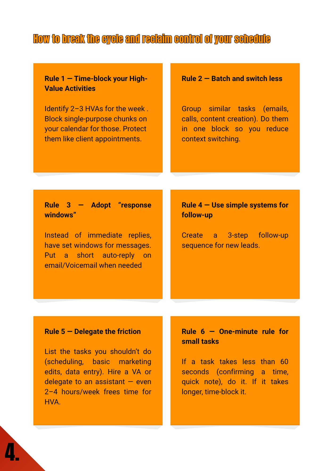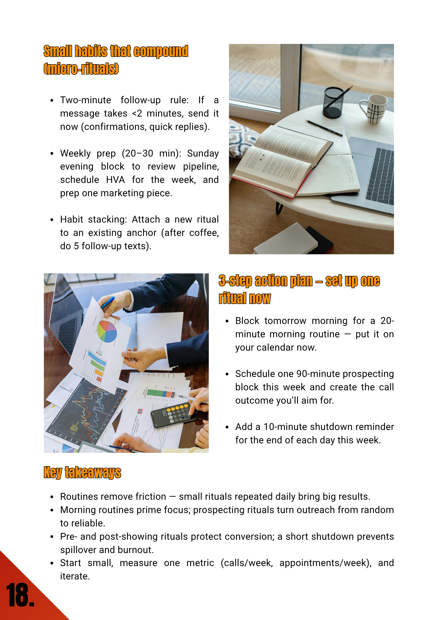 A practical, no-fluff playbook built by realtors for realtors - 30+ pages of time-blocking frameworks, follow-up templates, prospecting rituals, and worksheets that turn busy days into predictable, profitable ones. Read fast. Use today.